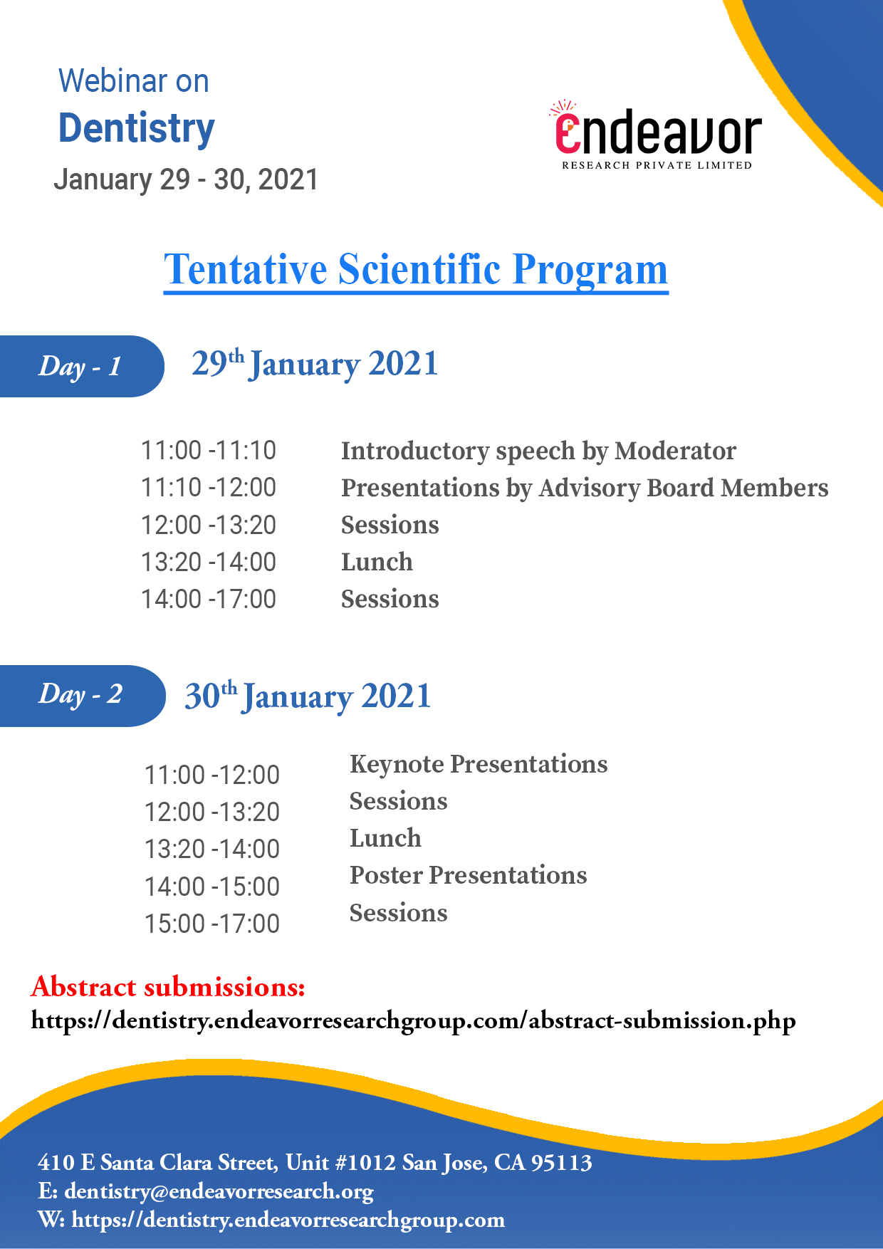 Endeavor Research private Limited is glad to announce the webinar on “Dentistry “which is going to be held on January 29-30, 2021. We are happy to bring together all anticipated participants to share and explore their research findings. The Dentistry webinar includes some highly cited presentations by keynote speakers and remaining Oral presentations.